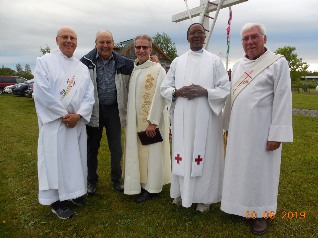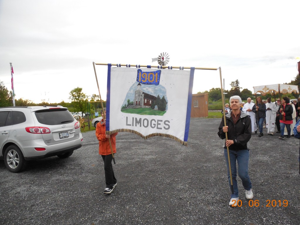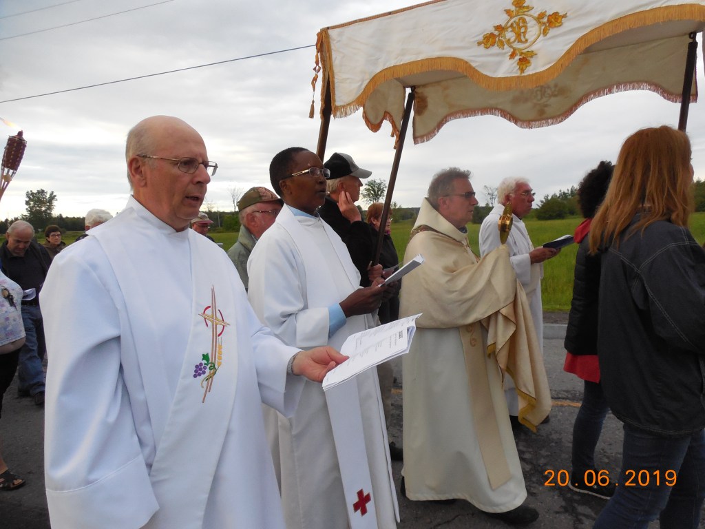 Comme prévu, la Procession de la Fête-Dieu à eu lieu le 20 juin 2019 malgré la menace de pluie. Ce n’est que vers 18h que le pluie à cessée, à temps pour le commencement de la Procession à 19h. Une messe fut dite par Michel Pommainville, Curé d’Embrun assisté de M. Edouard Ntiyankundiye, Curé le Limoges, et les diacres Marcel Givogue et André Pommainville. Les chants de circonstances furent fournis par la chorale de Limoges sous la direction de M. Bernard Demers.