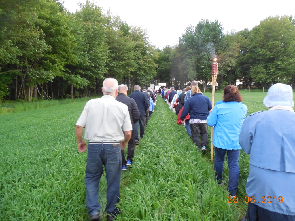 La procession se mit en branle vers 19:30 en se dirigeant sur le chemin Pommainville. Une voiture avec amplificateur dirigeait le chant et les prières. Deux croix blanches ornaient le coté du chemin indiquant deux stations de prières présentées par des membres des différentes paroisses. Après 1/2 km, la procession bifurqua pour emprunter une route temporaire fait à même le chant de blé de M.Réjean Pommainville pour terminer au reposoir à la jolie chapelle des propriétaires. À la fin de la cérémonie, le soleil illumina le ciel, soit-il, afin de remercier la foule d’approximativement 100 personnes. La Procession de la Fête-Dieu, exclusivement en campagne, venait d’avoir lieu pour la première fois. Nous espérons que ce sera la première d’une succession annuelle.